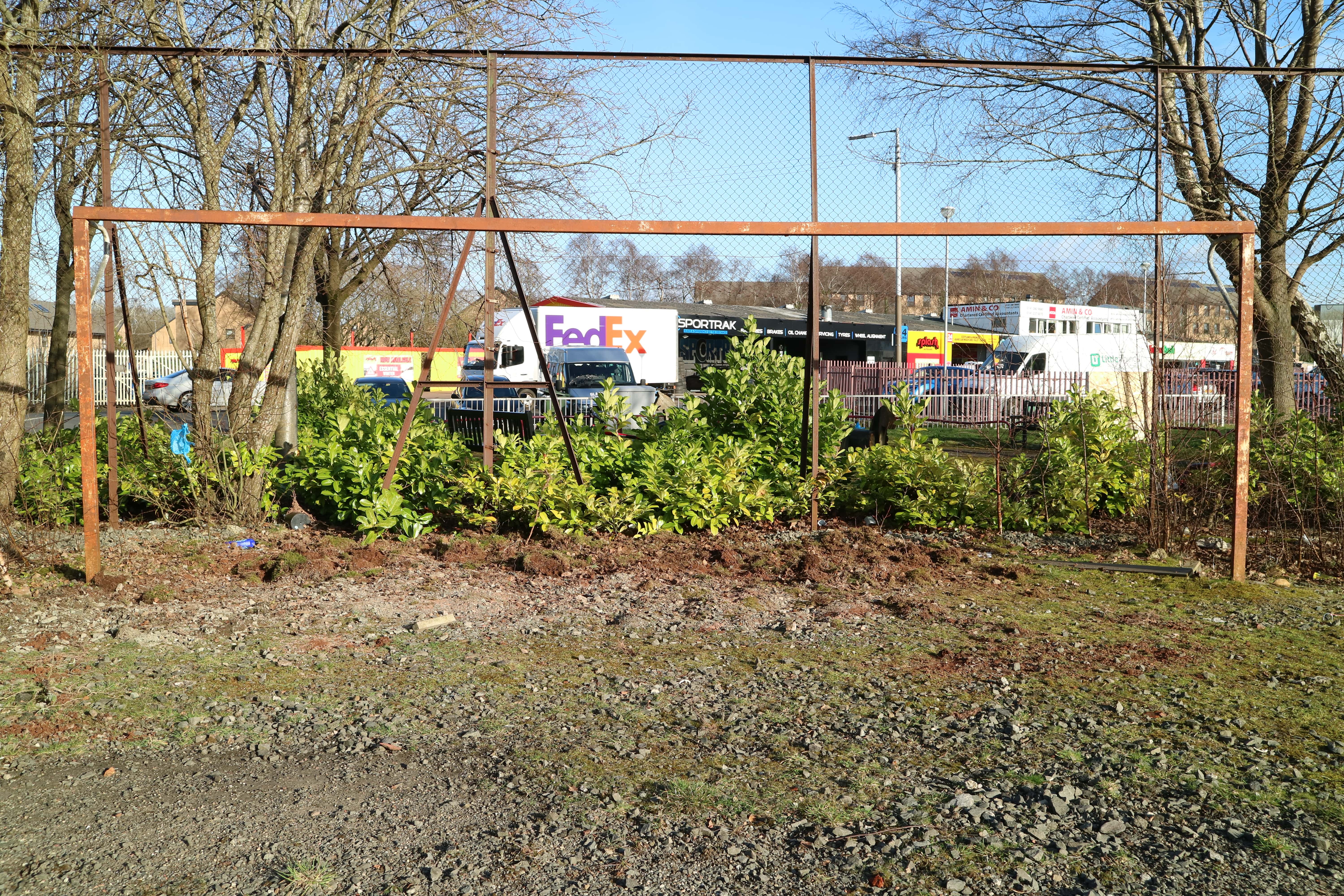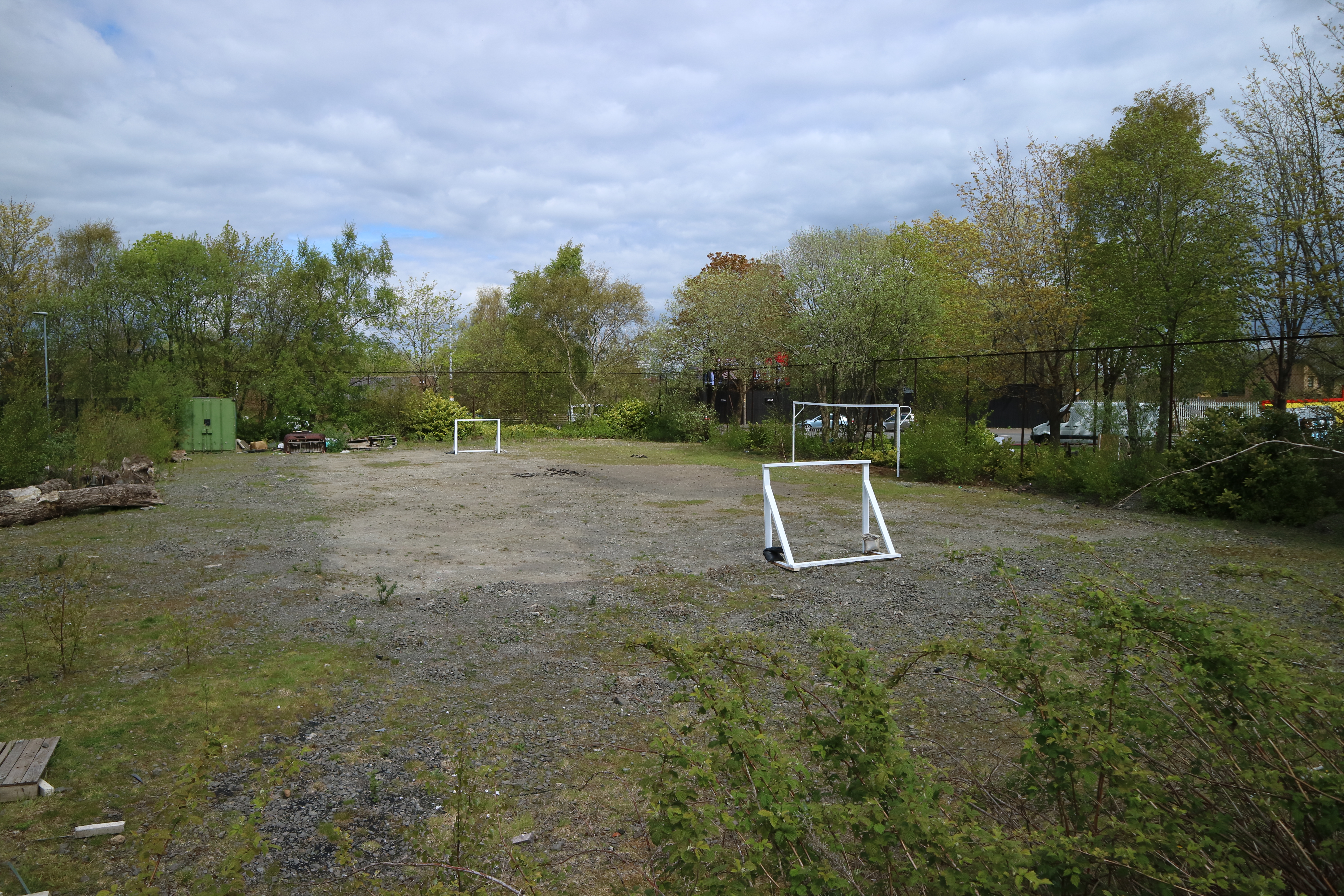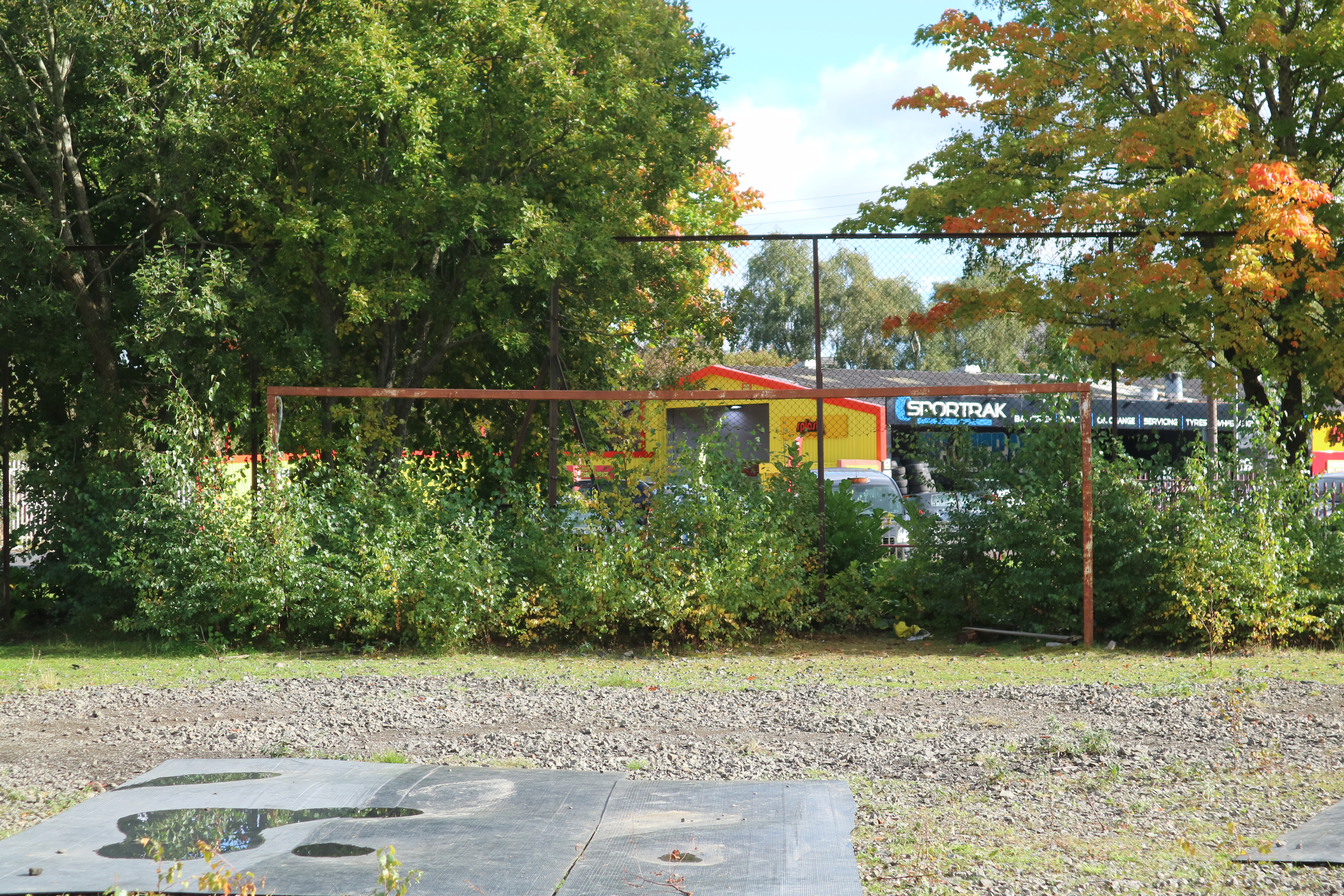 Photo taken during one of the first visits to the pitch. Small trees and bushes surround and grow inside the goal mouth. Goalposts covered in rust. Ground surface covered in big pieces of gravel and large plastic board dumped on ground.
