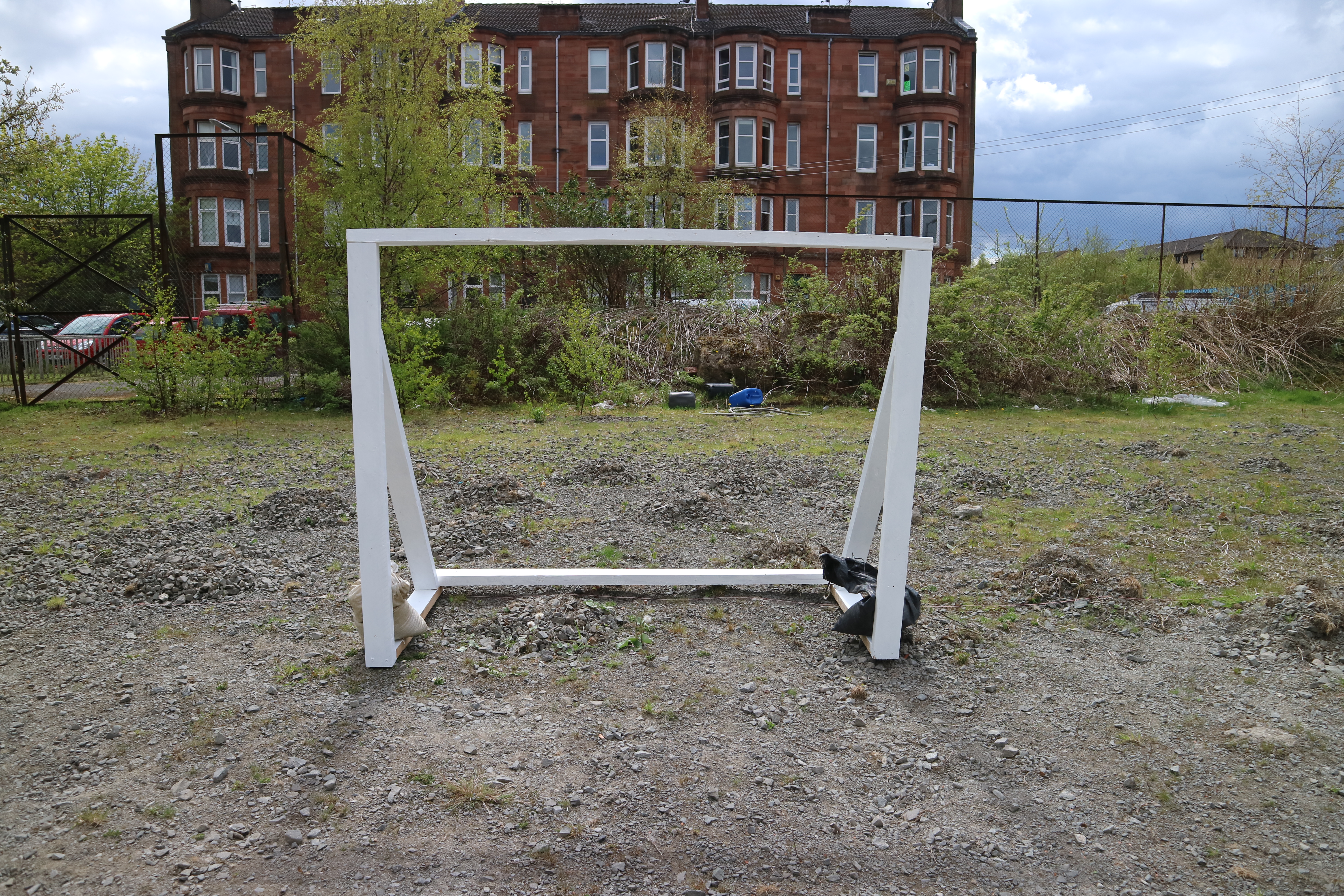 Goalposts painted with white metal paint. Two coats of paint needed.