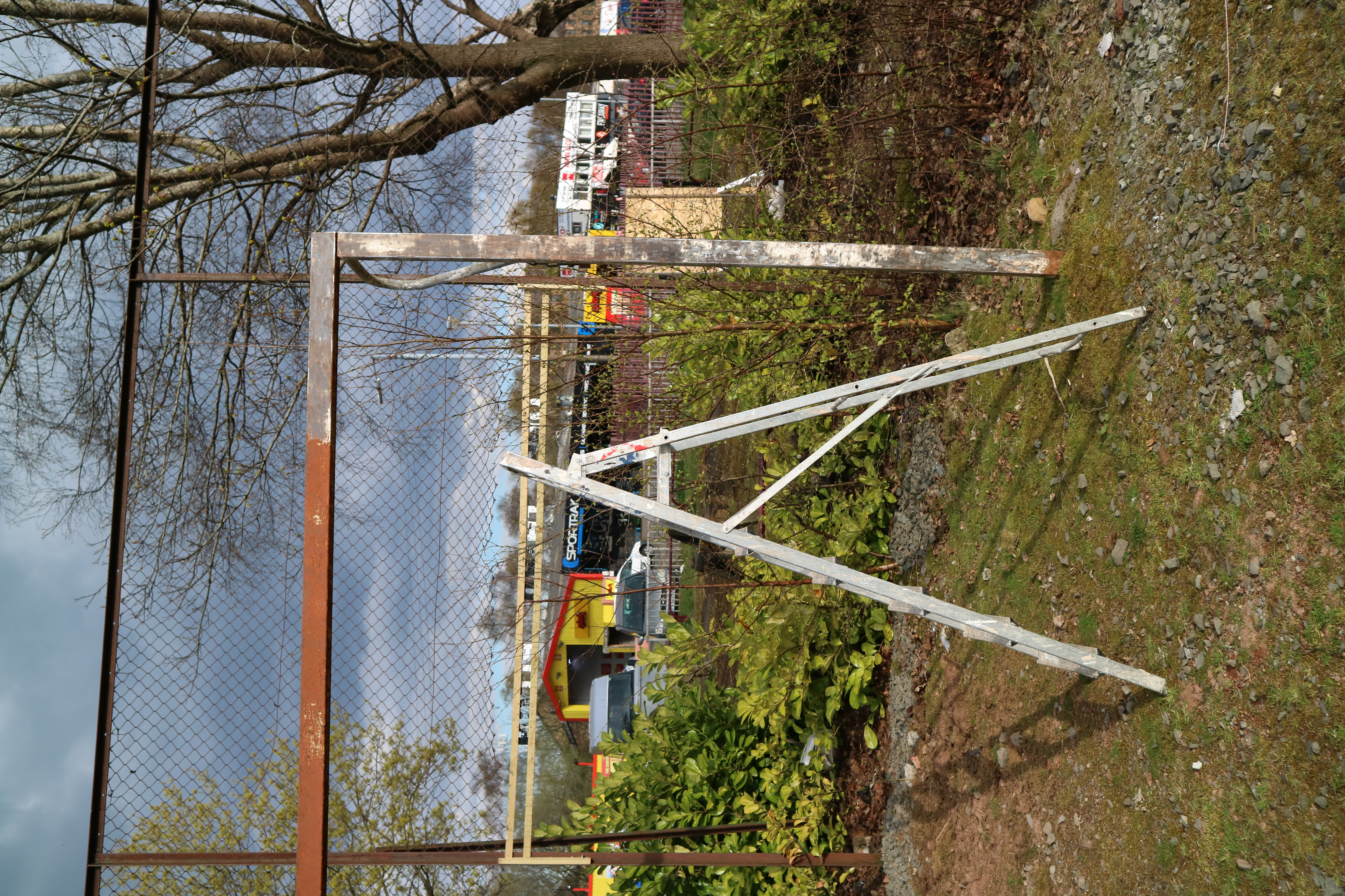 Rust grinded off goalposts. As the rust in grinded off it appears that the goalposts have semi disappered out of sight.