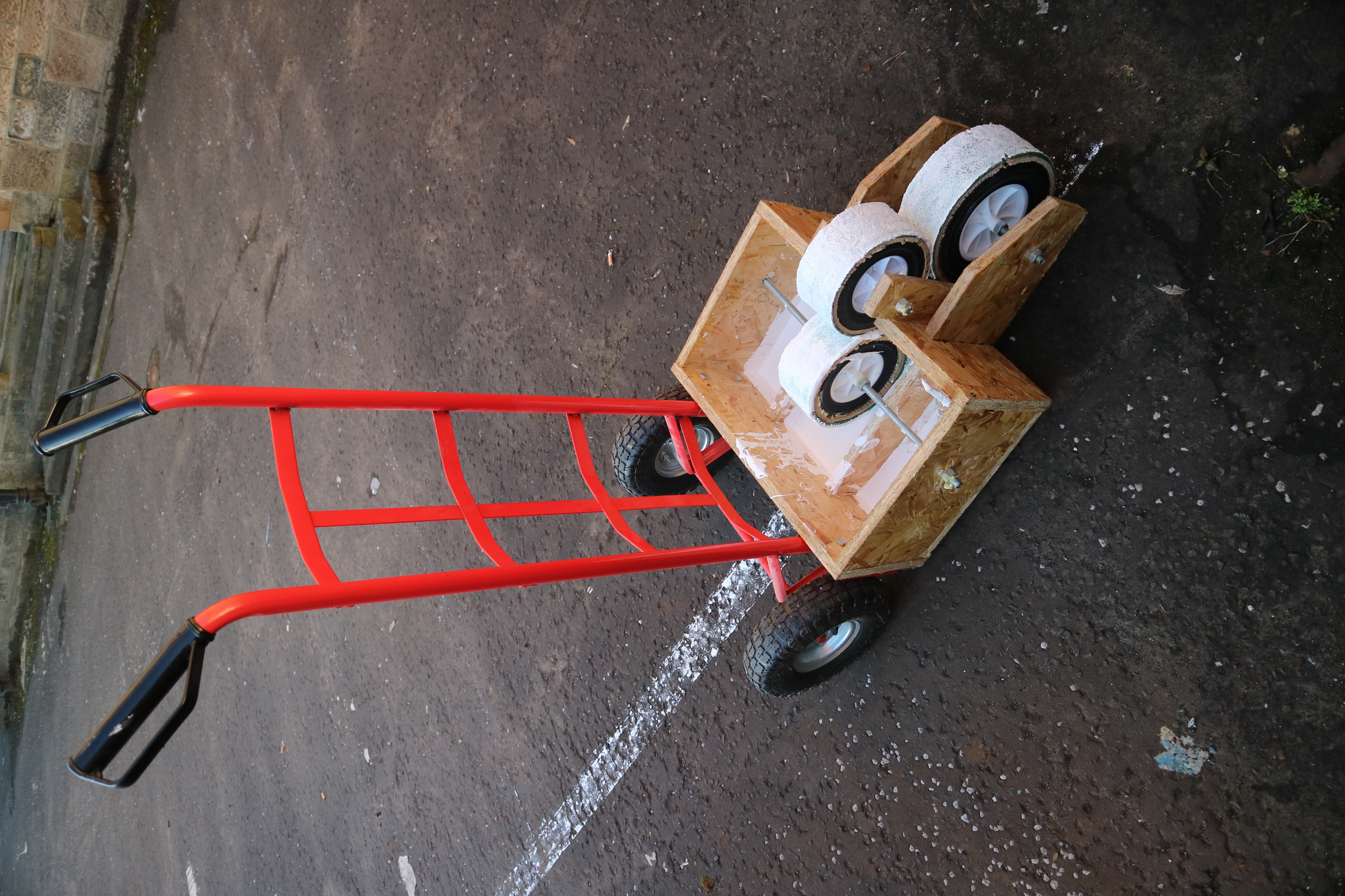 Rubber wheels, Flexible MDF board, green scourers, threaded steel rod, OBS board, nuts and bolts, Sack truck.
