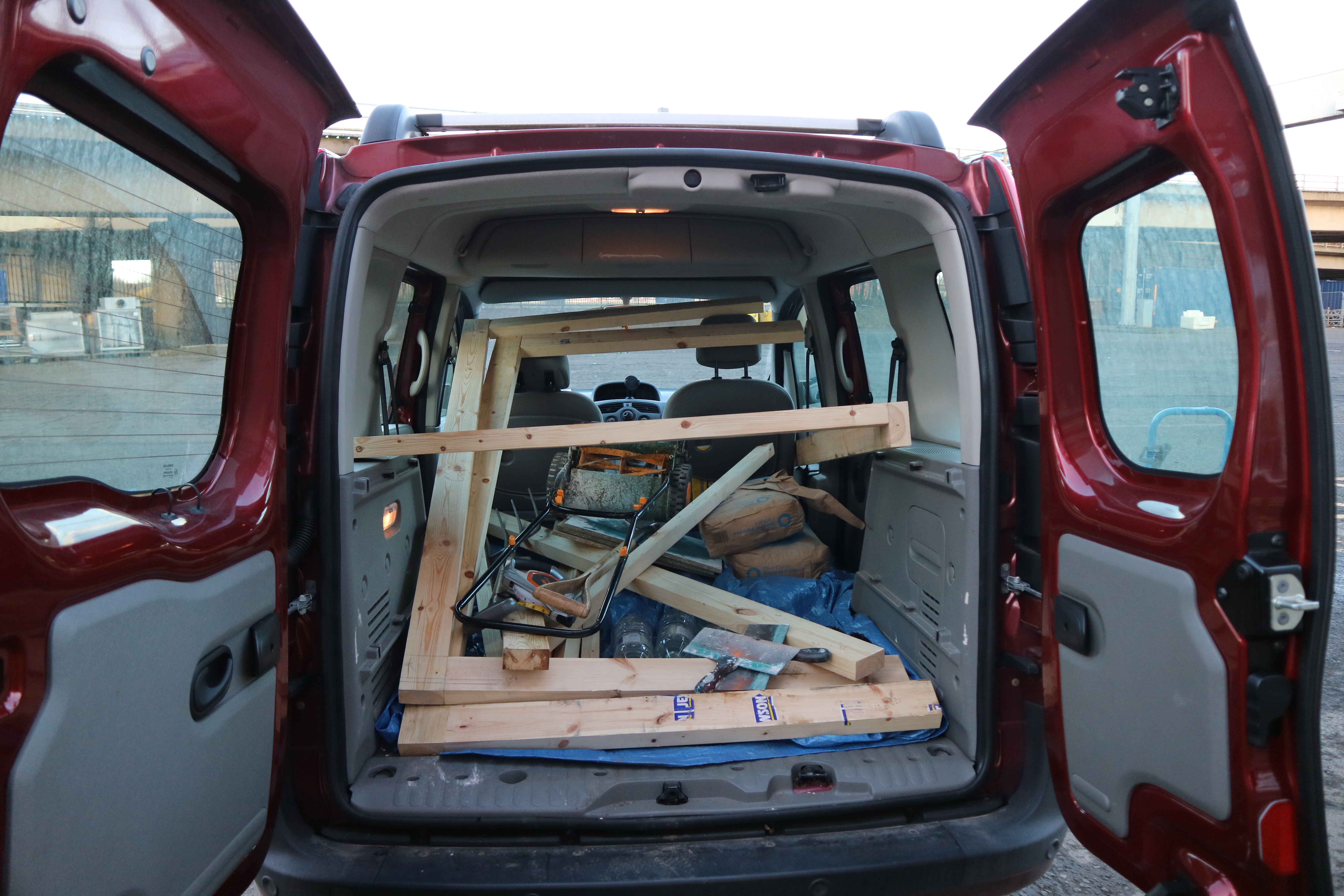 Loading the van to begin the restoration of the restored football pitch. Hand propelled lawnmower, bags of cement, shovels and partially constructed goals.