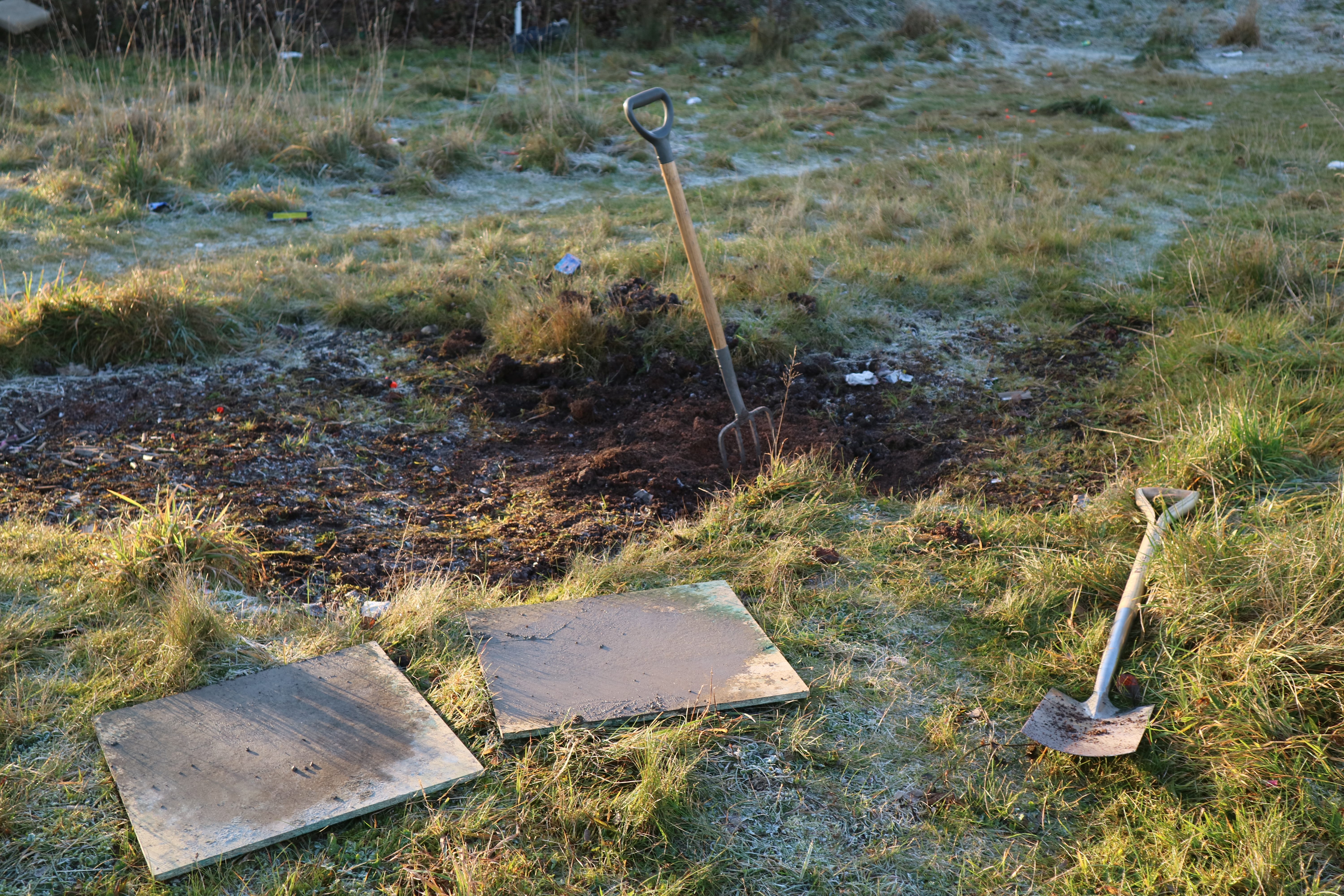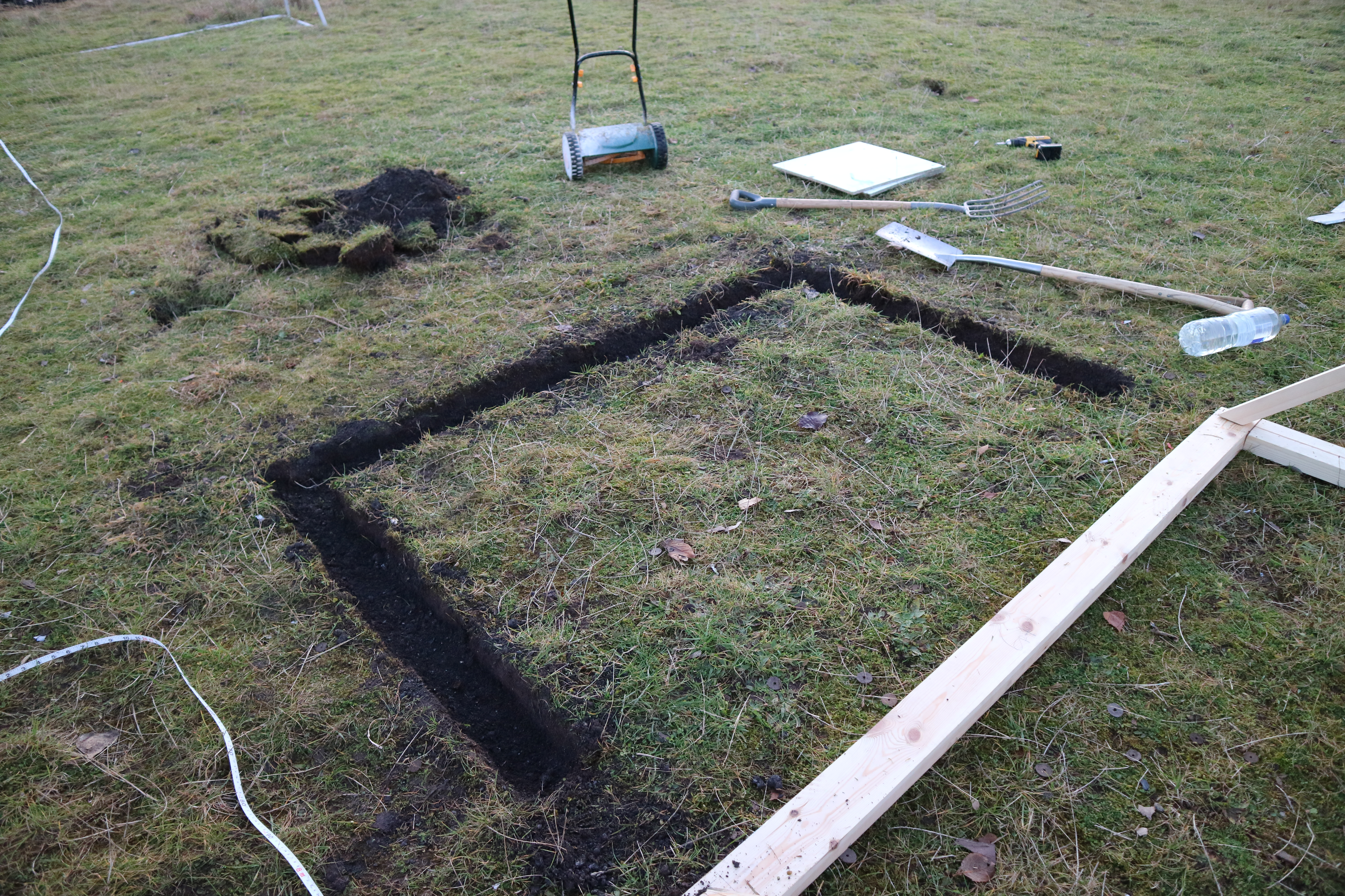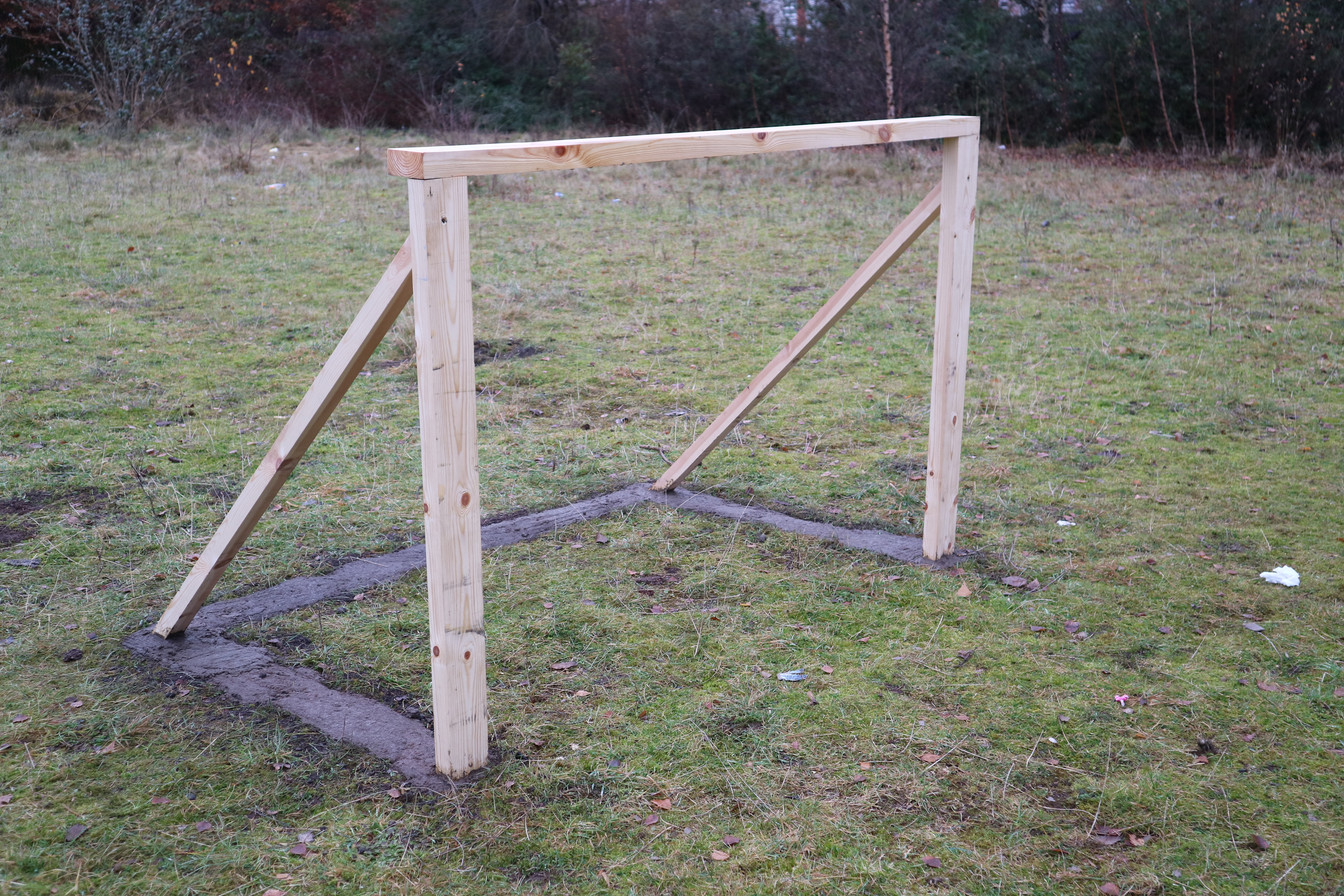 Goalposts installed on site. Imprint of base of goalposts marked and dug out of ground. Goals placed in them.