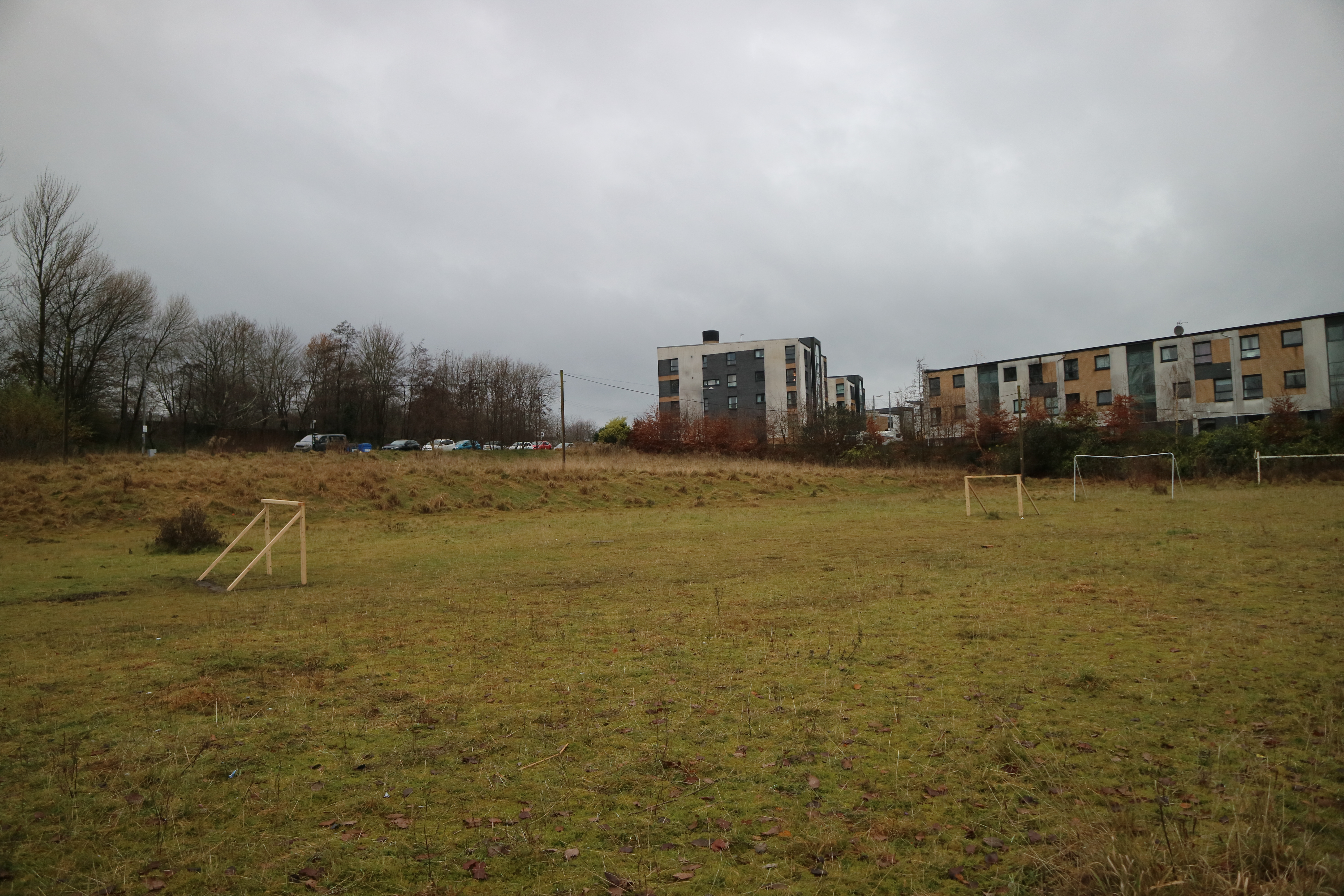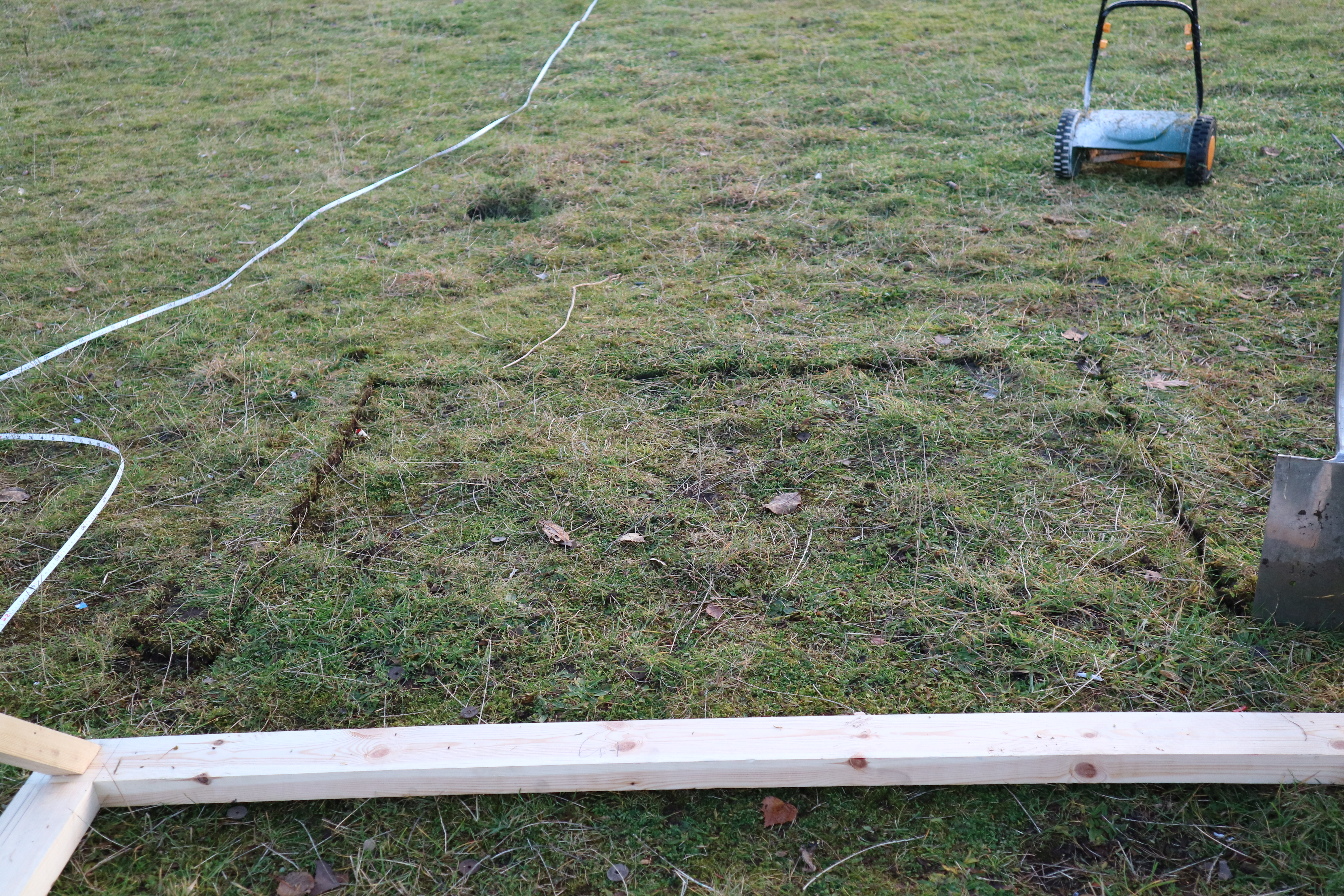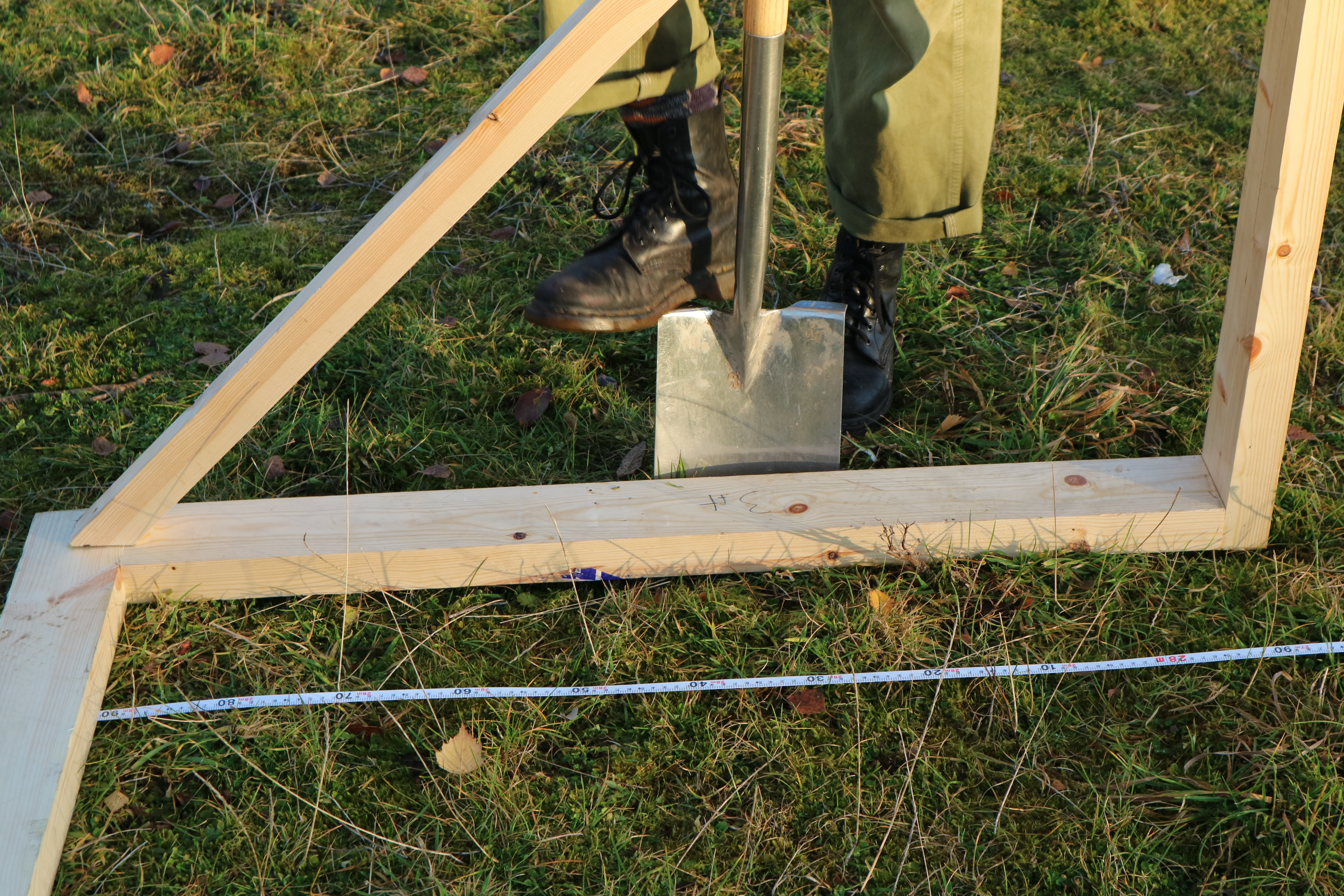 Goalposts installed on site. Imprint of base of goalposts marked and dug out of ground. Goals placed in them.