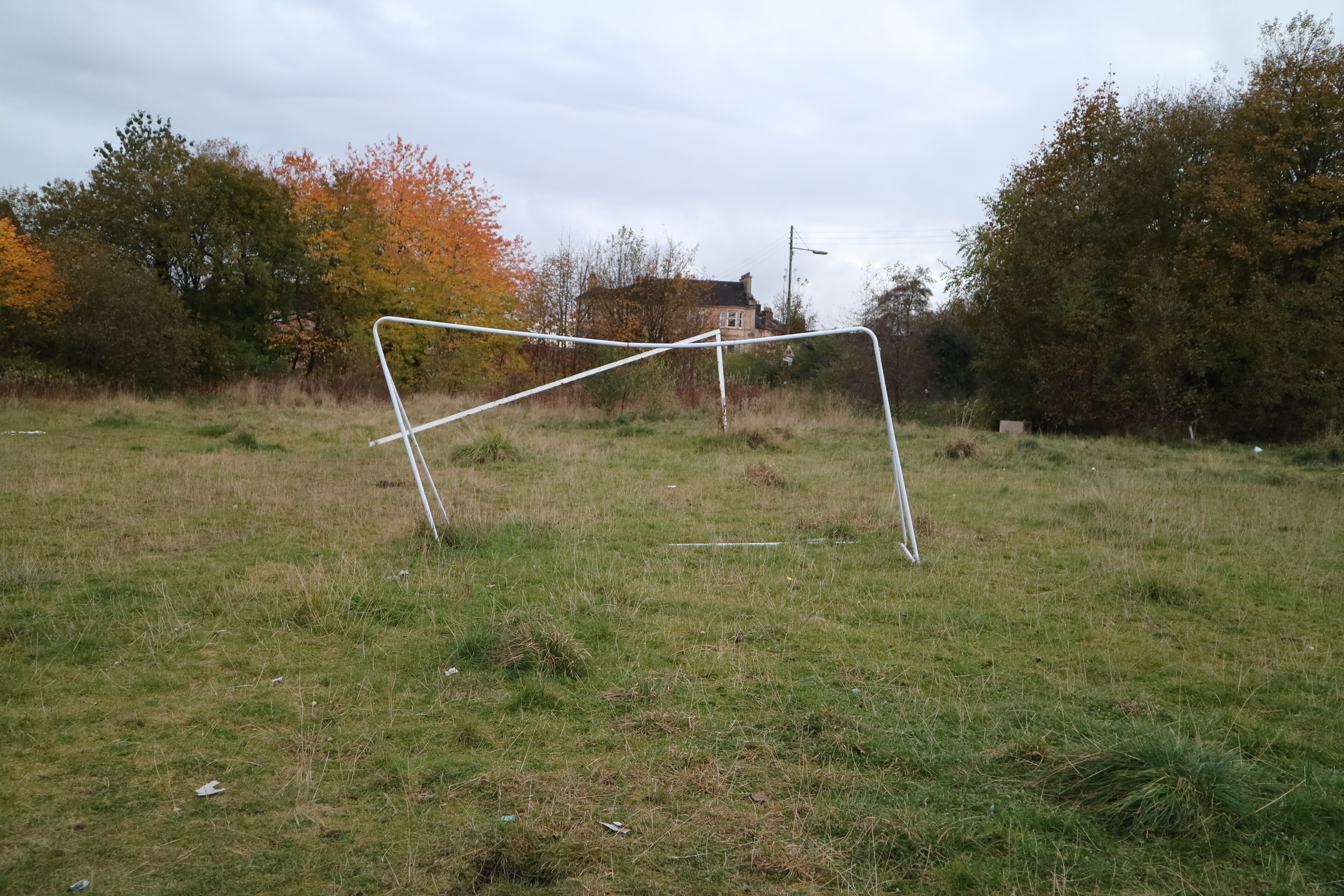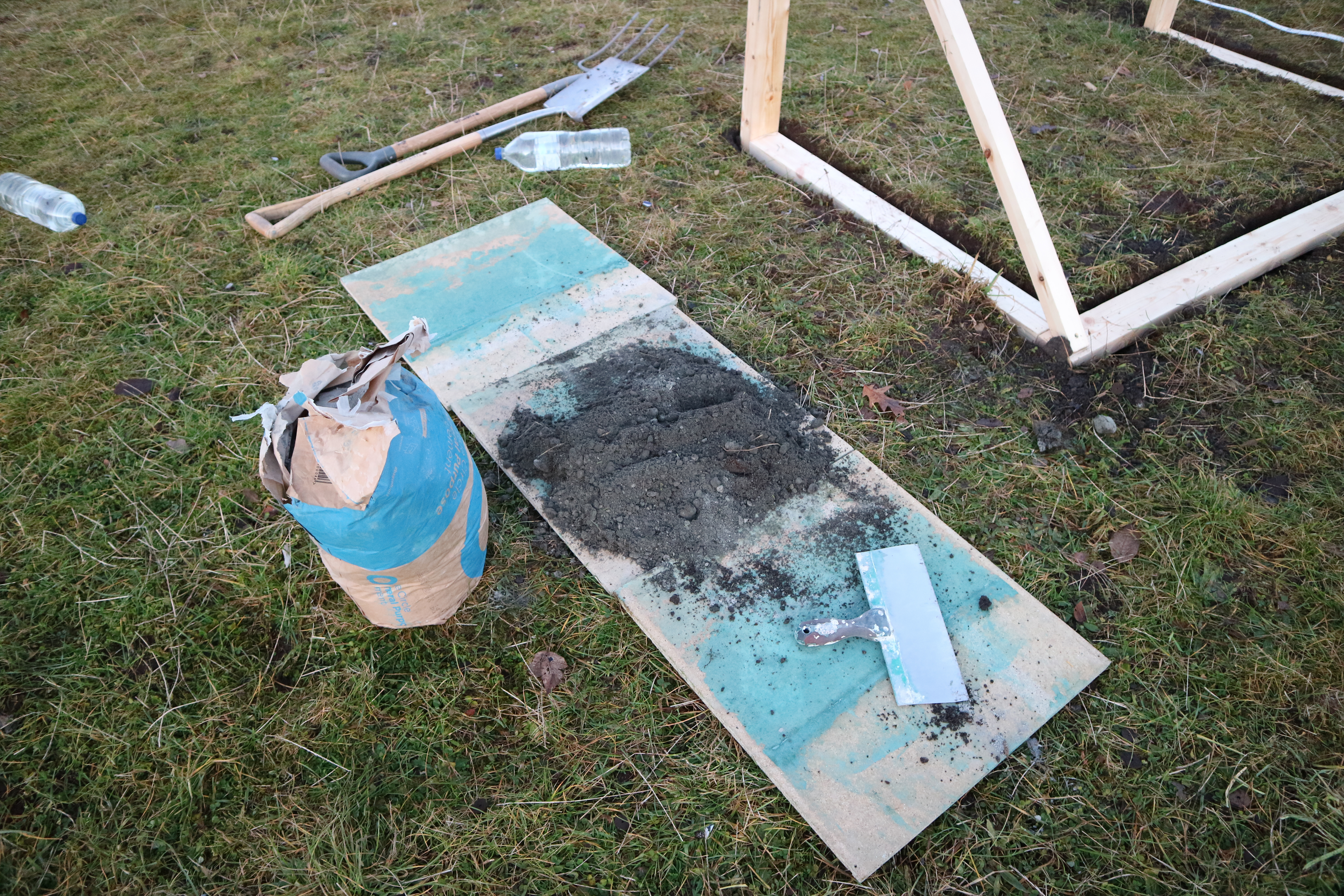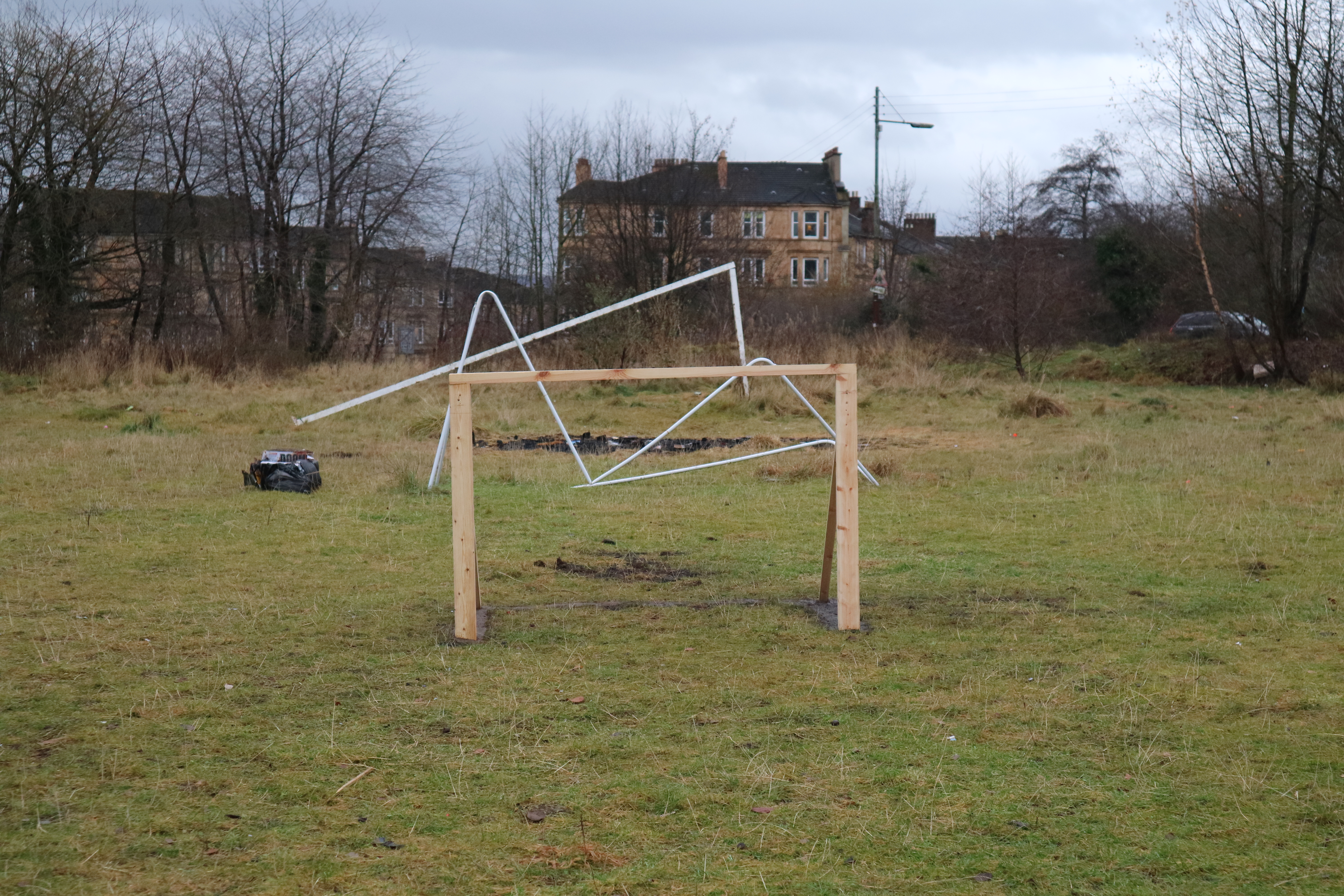 Goalposts secured using concrete: cement mixed with blaes gravel from the original surface of the pitch found beneath the grass.