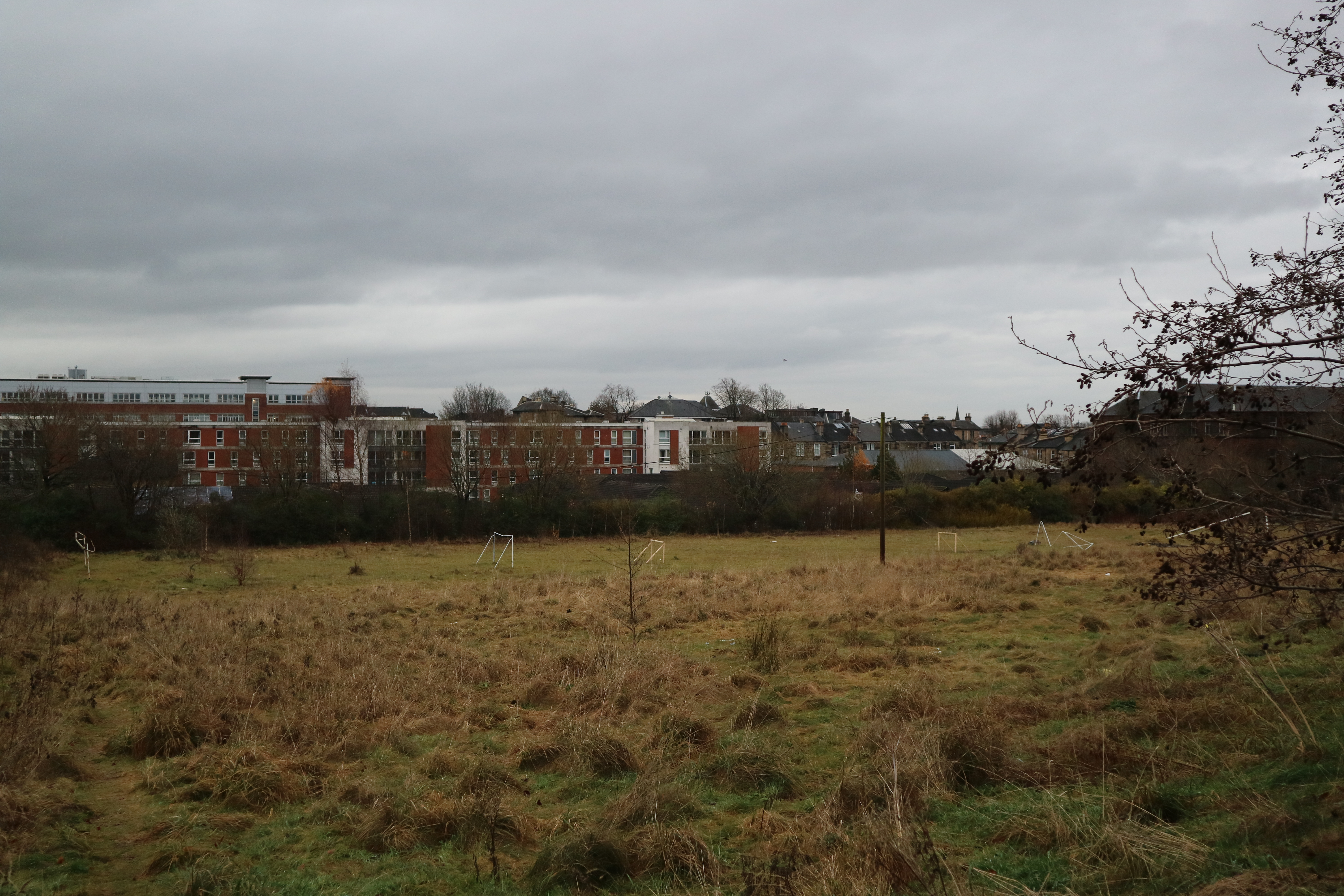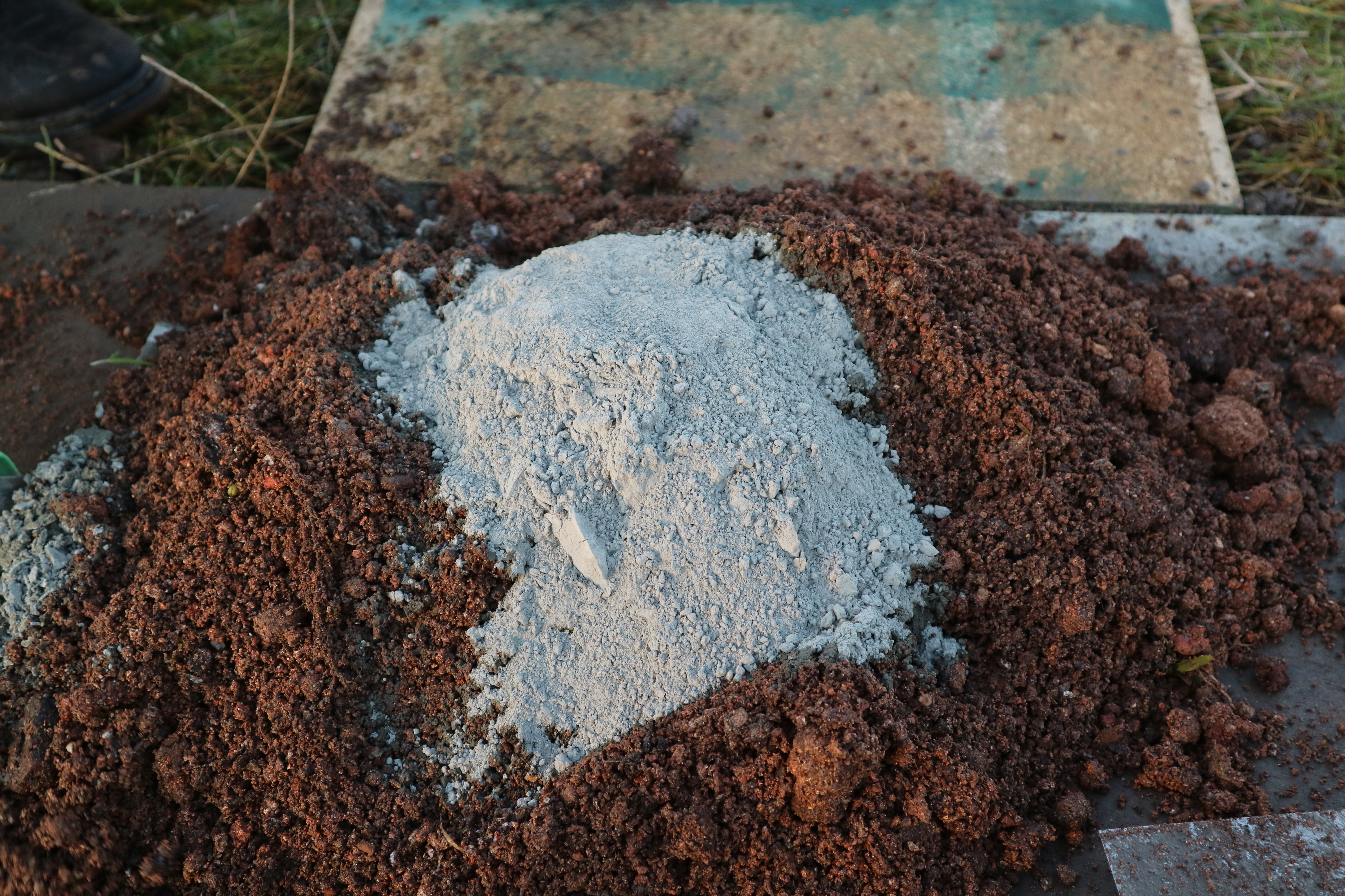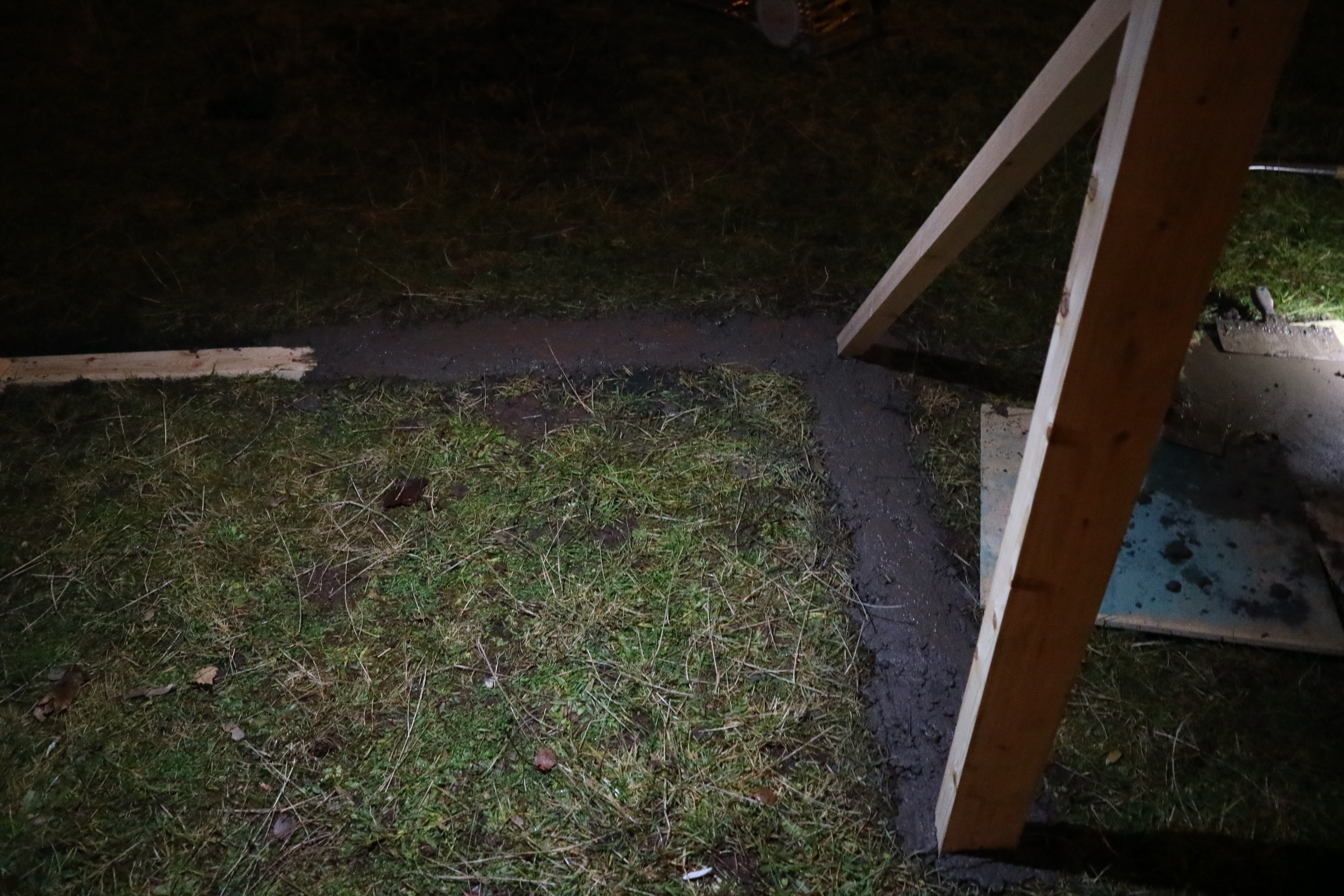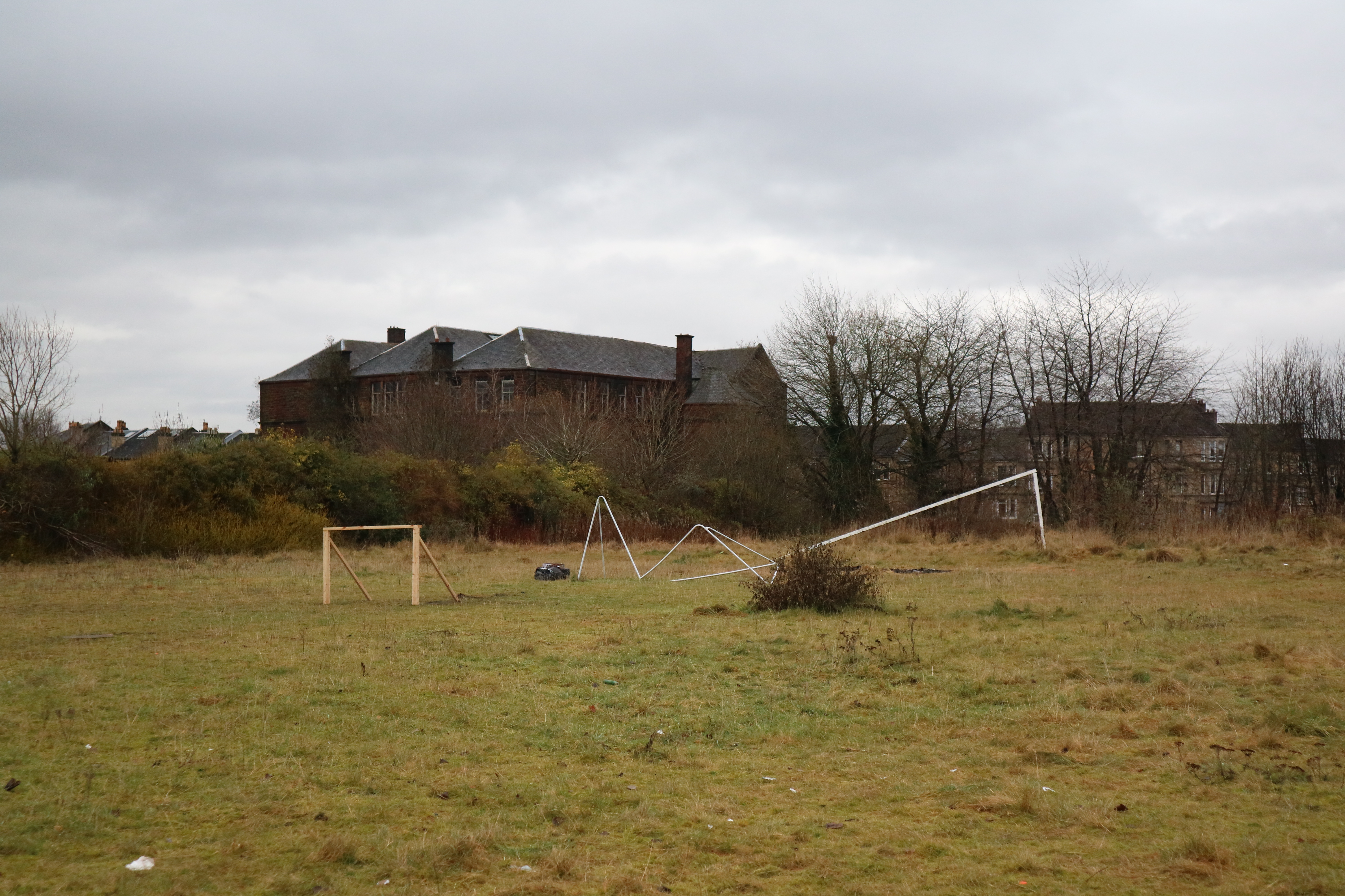 Goalposts secured using concrete: cement mixed with blaes gravel from the original surface of the pitch found beneath the grass.